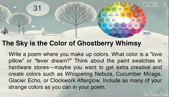 👻 Haunted House Reading? Editing Tip? Poetry Prompt? --Yes, Yes, Yes.And a Few Things from Two Sylvias Press!It’s the Most Wonderful Time of the Year 👻 🍁 & Copper Canyon Press ReadingHow is it November 5th already? Because I love Spooky Season (Oct. 1–31), I really tried to slow down October—watching Halloween shows, lighting candles, doing something autumn-festive almost every day—but somehow we’ve still arrived at the darker days of November with the sun setting at 4:46 p.m. tonight in the Pacific Northwest. Yes, night is coming earlier now and it’s pouring outside as I type this, but the good news? This darkness and weather make for perfect writing time. I had the joy of reading from my next collection, Accidental Devotions, at the gorgeous (slightly haunted) Stimson-Green Mansion hosted by Copper Canyon Press. After a stretch of gorgeous autumn days, we got a stormy, windy Seattle night—one of those “who’s even leaving their house?” evenings, in fact, I was convinced it would be me in this giant mansion reading to ghosts. But somehow (magic?), it was a full house! I have never been to this mansion before, but it was the perfect historic (read: spooky) place to be a week before Halloween. And I did read a poem about a seance with Rilke’s ghost and well, nothing fell from the walls, so maybe not that haunted. It also reminded me how good it feels to be around people who genuinely love poetry. Since the pandemic, I’ve found it harder to motivate myself to go out to events in Seattle. I joke with friends, “Remember when we used to do things?” But that night, it felt good to show up, to be part of something meaningful. I’ve been thinking about how important it is to support the things we want to last—especially the arts. Copper Canyon remains one of the rare long-time presses entirely devoted to poetry, and I’m so grateful to be part of their family. The event was also a fundraiser, so if you’d like to help them keep bringing more poetry into the world—you can make a donation here. An Editing Tip for ManuscriptsSpeaking of Accidental Devotions (Copper Canyon Press)—I am on my second set of proofs (the book will be published May 12, 2026)! One of the coolest things Copper Canyon does are these “proof sheets,” which are fantastic if you’re trying to edit your own manuscript. Basically, if you use a word that can be spelled two ways (“blond” vs. “blonde”), you jot it under that letter with the page number to make sure you’re consistent. They also include any nonstandard words—which, as you can guess, I use plenty of. And the bonus of this task: you end up with this bizarre little museum of your book’s vocabulary. Mine includes “afterlife” (five times!) along with some of my invented words like duskbirds, lustheavy, and rosesmoke. So here’s your tip—if you’re working on a manuscript, I really recommend trying this as you can easily create your own proof sheet—it’s a surprisingly effective way to catch small mistakes before you submit. ✍️ Two Sylvias Offerings Right Now:Despite everything—and a rent hike (!!)—Annette Spaulding-Convy and I are still here, keeping Two Sylvias Press afloat in these wild times. Annette and I have also been busy writing new poetry prompts and exercises to help folks stay creative (and sane!) through it all. Here are two ways to stop the “doomscrolling” and start a little “poemquesting.”